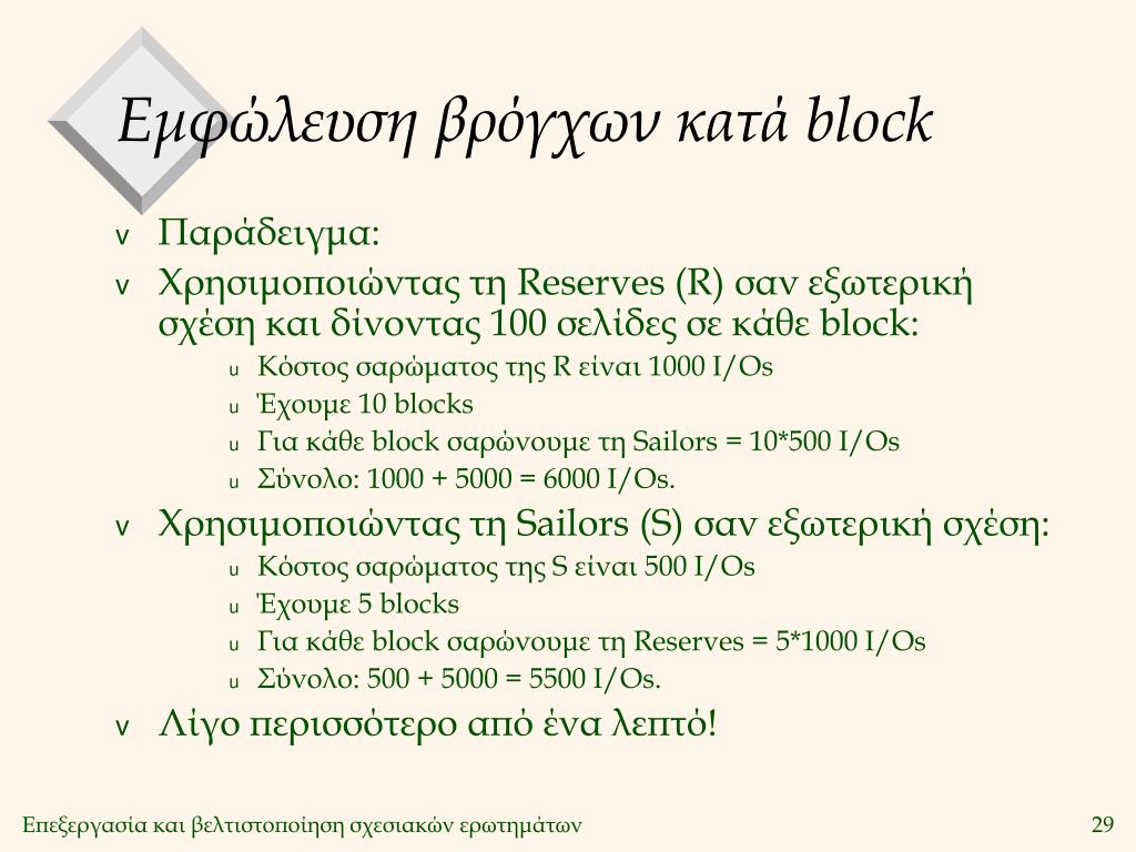Εμφώλευση βρόγχων κατά block • Παράδειγμα: • Χρησιμοποιώντας τη Reserves (R) σαν εξωτερική σχέση και δίνοντας 100 σελίδες σε κάθε block: • Κόστος σαρώματος της R είναι 1000 Ι/Οs • Έχουμε 10 blocks • Για κάθε block σαρώνουμε τη Sailors = 10*500 Ι/Οs • Σύνολο: 1000 + 5000 = 6000 Ι/Οs. • Χρησιμοποιώντας τη Sailors (S) σαν εξωτερική σχέση: • Κόστος σαρώματος της S είναι 500 Ι/Οs • Έχουμε 5 blocks • Για κάθε block σαρώνουμε τη Reserves = 5*1000 Ι/Οs • Σύνολο: 500 + 5000 = 5500 Ι/Οs. • Λίγο περισσότερο από ένα λεπτό!