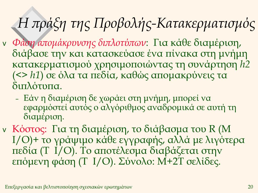 Η πράξη της Προβολής-Κατακερματισμός • Φάση απομάκρυνσης διπλοτύπων: Για κάθε διαμέριση, διάβασε την και κατασκεύασε έναπίνακα στη μνήμη κατακερματισμού χρησιμοποιώντας τη συνάρτησηh2 (<> h1) σε όλα τα πεδία, καθώς απομακρύνεις τα διπλότυπα. • Εάν η διαμέριση δε χωράει στη μνήμη, μπορεί να εφαρμόστεί αυτός ο αλγόριθμος αναδρομικά σε αυτή τη διαμέριση. • Κόστος: Για τη διαμέριση, το διάβασμα του R (Μ Ι/Ο)+ το γράψιμο κάθε εγγραφής, αλλά με λιγότερα πεδία (Τ Ι/Ο). Το αποτέλεσμαδιαβάζεται στην επόμενη φάση (Τ Ι/Ο). Σύνολο: Μ+2Τ σελίδες.
