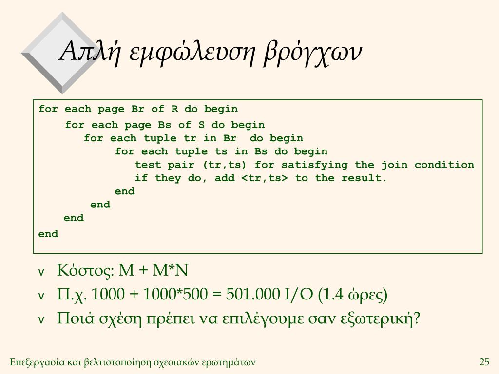 Απλή εμφώλευση βρόγχων for each page Br of R do begin for each page Bs of S do beginfor each tuple tr in Br do beginfor each tuple ts in Bs do begintest pair (tr,ts) for satisfying the join condition if they do, add <tr,ts> to the result.endendend end • Κόστος: Μ + Μ*Ν • Π.χ. 1000 + 1000*500 = 501.000 Ι/Ο (1.4 ώρες) • Ποιά σχέση πρέπει να επιλέγουμε σαν εξωτερική?