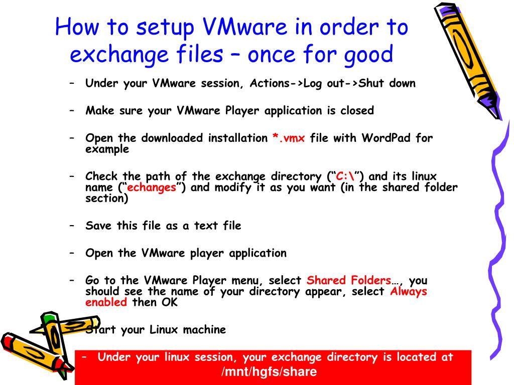 How to setup VMware in order to exchange files – once for good • Under your VMware session, Actions->Log out->Shut down • Make sure your VMware Player application is closed • Open the downloaded installation *.vmx file with WordPad for example • Check the path of the exchange directory (“C:\”) and its linux name (“echanges”) and modify it as you want (in the shared folder section) • Save this file as a text file • Open the VMware player application • Go to the VMware Player menu, select Shared Folders…, you should see the name of your directory appear, select Always enabled then OK • Start your Linux machine • Under your linux session, your exchange directory is located at /mnt/hgfs/share