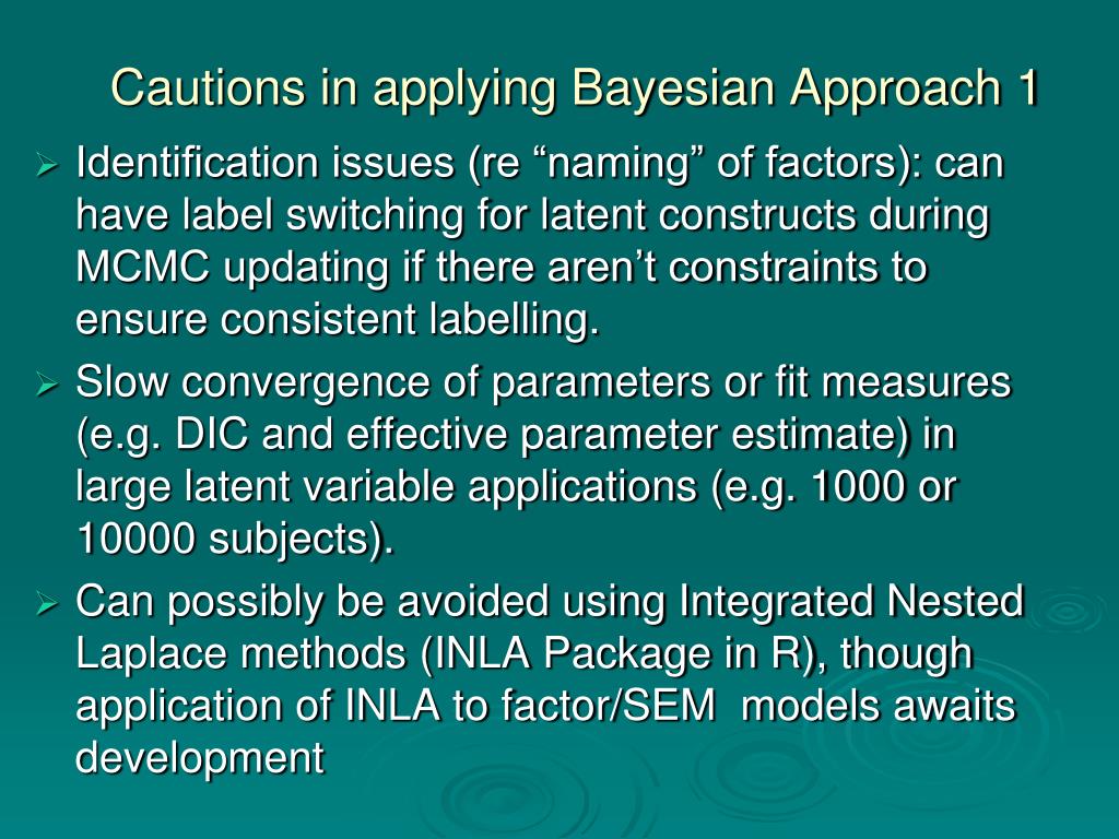 Cautions in applying Bayesian Approach 1 • Identification issues (re “naming” of factors): can have label switching for latent constructs during MCMC updating if there aren’t constraints to ensure consistent labelling. • Slow convergence of parameters or fit measures (e.g. DIC and effective parameter estimate) in large latent variable applications (e.g. 1000 or 10000 subjects). • Can possibly be avoided using Integrated Nested Laplace methods (INLA Package in R), though application of INLA to factor/SEM models awaits development