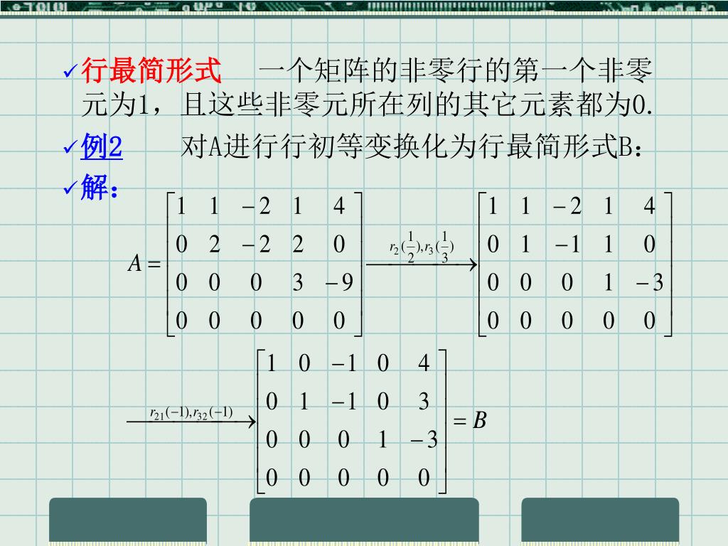 行最简形式 一个矩阵的非零行的第一个非零元为1,且这些非零元所在列的其它元素都为0. • 例2对A进行行初等变换化为行最简形式B: • 解: