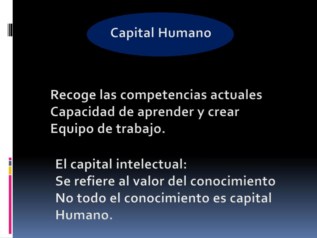 Capital Humano Recoge las competencias actuales Capacidad de aprender y crear Equipo de trabajo. El capital intelectual: Se refiere al valor del conocimiento No todo el conocimiento es capital Humano.