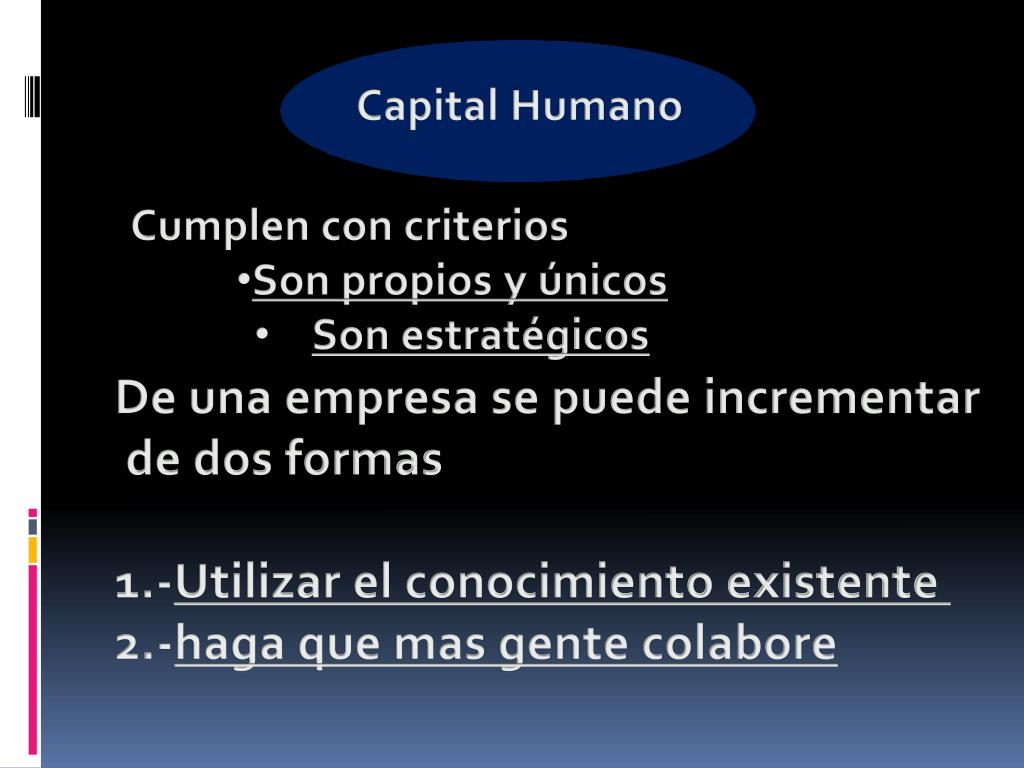 Capital Humano • Cumplen con criterios • Son propios y únicos • Son estratégicos De una empresa se puede incrementar de dos formas 1.-Utilizar el conocimiento existente 2.-haga que mas gente colabore