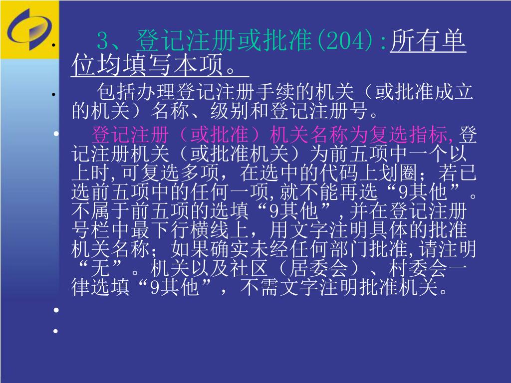 3、登记注册或批准(204):所有单位均填写本项。3、登记注册或批准(204):所有单位均填写本项。 • 包括办理登记注册手续的机关(或批准成立的机关)名称、级别和登记注册号。 • 登记注册(或批准)机关名称为复选指标,登记注册机关(或批准机关)为前五项中一个以上时,可复选多项,在选中的代码上划圈;若已选前五项中的任何一项,就不能再选“9其他”。不属于前五项的选填“9其他”,并在登记注册号栏中最下行横线上,用文字注明具体的批准机关名称;如果确实未经任何部门批准,请注明“无”。机关以及社区(居委会)、村委会一律选填“9其他”,不需文字注明批准机关。
