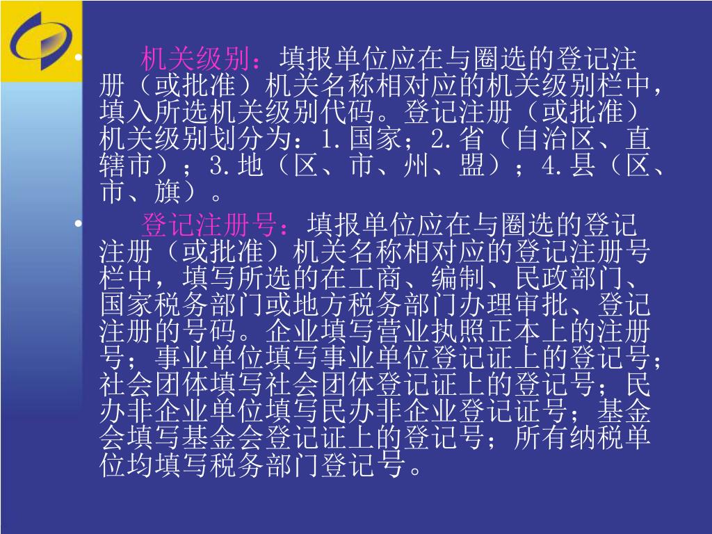 机关级别:填报单位应在与圈选的登记注册(或批准)机关名称相对应的机关级别栏中,填入所选机关级别代码。登记注册(或批准)机关级别划分为:1.国家;2.省(自治区、直辖市);3.地(区、市、州、盟);4.县(区、市、旗)。机关级别:填报单位应在与圈选的登记注册(或批准)机关名称相对应的机关级别栏中,填入所选机关级别代码。登记注册(或批准)机关级别划分为:1.国家;2.省(自治区、直辖市);3.地(区、市、州、盟);4.县(区、市、旗)。 • 登记注册号:填报单位应在与圈选的登记注册(或批准)机关名称相对应的登记注册号栏中,填写所选的在工商、编制、民政部门、国家税务部门或地方税务部门办理审批、登记注册的号码。企业填写营业执照正本上的注册号;事业单位填写事业单位登记证上的登记号;社会团体填写社会团体登记证上的登记号;民办非企业单位填写民办非企业登记证号;基金会填写基金会登记证上的登记号;所有纳税单位均填写税务部门登记号。