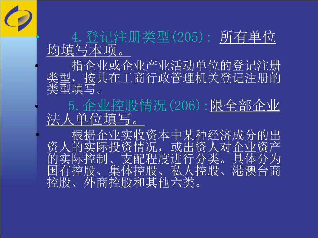 4.登记注册类型(205):所有单位均填写本项。 • 指企业或企业产业活动单位的登记注册类型,按其在工商行政管理机关登记注册的类型填写。 • 5.企业控股情况(206):限全部企业法人单位填写。 • 根据企业实收资本中某种经济成分的出资人的实际投资情况,或出资人对企业资产的实际控制、支配程度进行分类。具体分为国有控股、集体控股、私人控股、港澳台商控股、外商控股和其他六类。