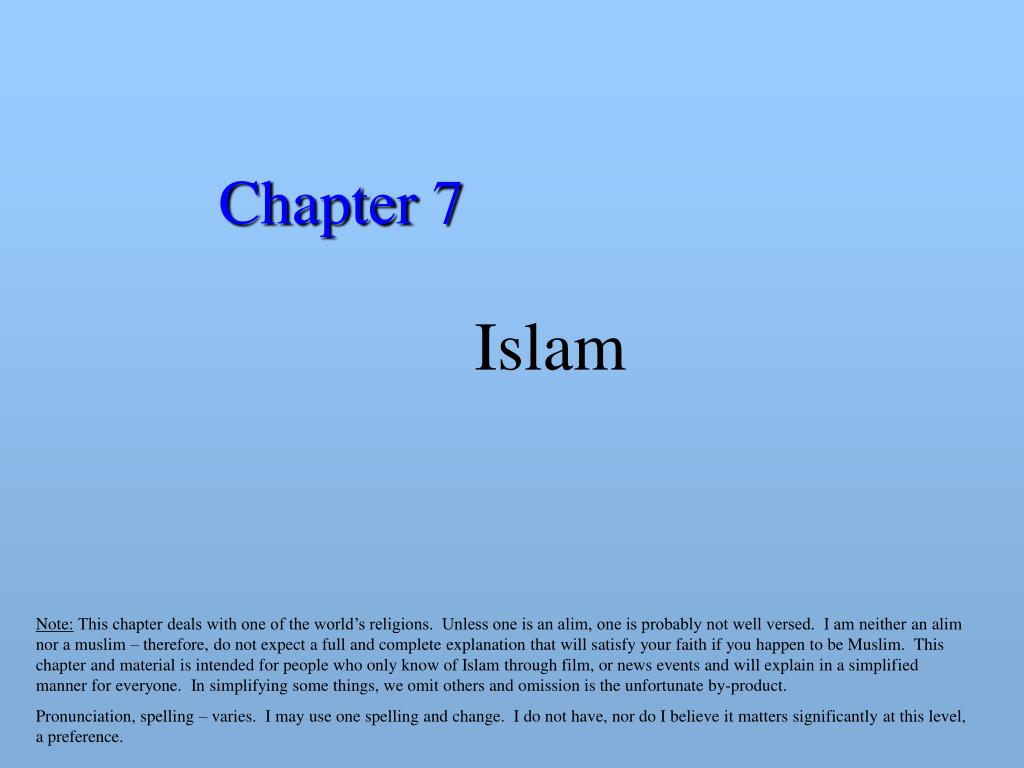 Chapter 7 Islam Note: This chapter deals with one of the world’s religions. Unless one is an alim, one is probably not well versed. I am neither an alim nor a muslim – therefore, do not expect a full and complete explanation that will satisfy your faith if you happen to be Muslim. This chapter and material is intended for people who only know of Islam through film, or news events and will explain in a simplified manner for everyone. In simplifying some things, we omit others and omission is the unfortunate by-product. Pronunciation, spelling – varies. I may use one spelling and change. I do not have, nor do I believe it matters significantly at this level, a preference.