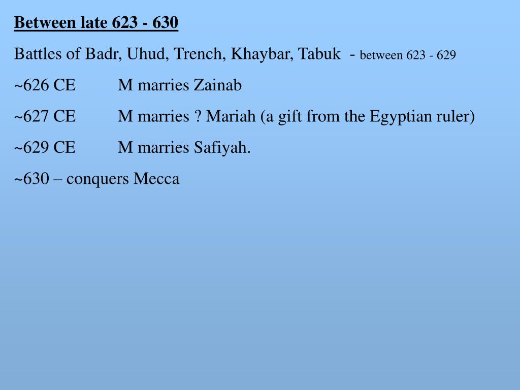 Between late 623 - 630 Battles of Badr, Uhud, Trench, Khaybar, Tabuk - between 623 - 629 ~626 CE M marries Zainab ~627 CE M marries ? Mariah (a gift from the Egyptian ruler) ~629 CE M marries Safiyah. ~630 – conquers Mecca