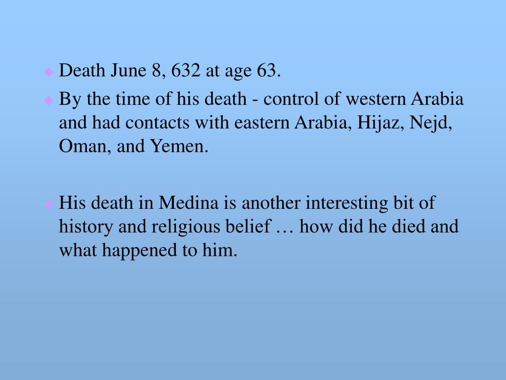 Death June 8, 632 at age 63. • By the time of his death - control of western Arabia and had contacts with eastern Arabia, Hijaz, Nejd, Oman, and Yemen. • His death in Medina is another interesting bit of history and religious belief … how did he died and what happened to him.
