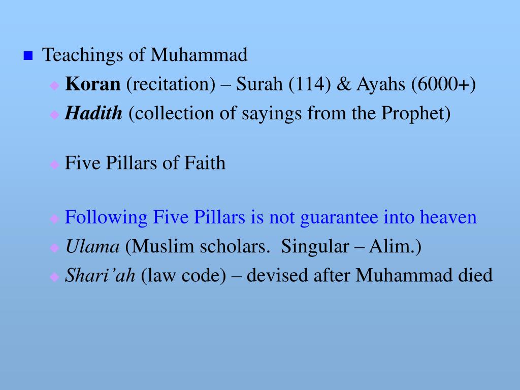 Teachings of Muhammad • Koran (recitation) – Surah (114) & Ayahs (6000+) • Hadith(collection of sayings from the Prophet) • Five Pillars of Faith • Following Five Pillars is not guarantee into heaven • Ulama (Muslim scholars. Singular – Alim.) • Shari’ah (law code) – devised after Muhammad died