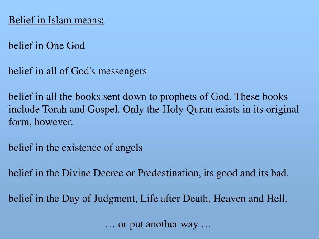 Belief in Islam means: belief in One God belief in all of God's messengers belief in all the books sent down to prophets of God. These books include Torah and Gospel. Only the Holy Quran exists in its original form, however. belief in the existence of angels belief in the Divine Decree or Predestination, its good and its bad. belief in the Day of Judgment, Life after Death, Heaven and Hell. … or put another way …