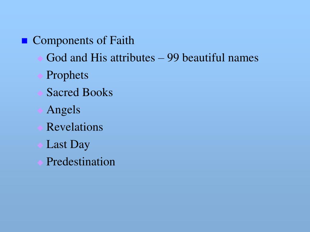 Components of Faith • God and His attributes – 99 beautiful names • Prophets • Sacred Books • Angels • Revelations • Last Day • Predestination