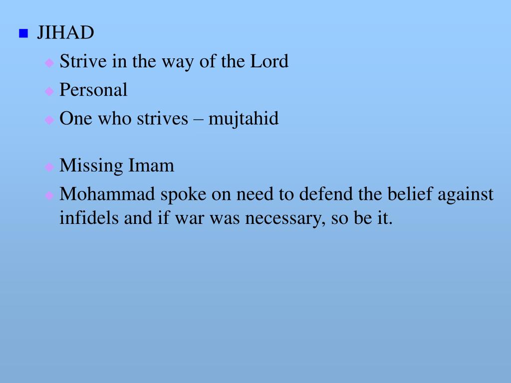 JIHAD • Strive in the way of the Lord • Personal • One who strives – mujtahid • Missing Imam • Mohammad spoke on need to defend the belief against infidels and if war was necessary, so be it.