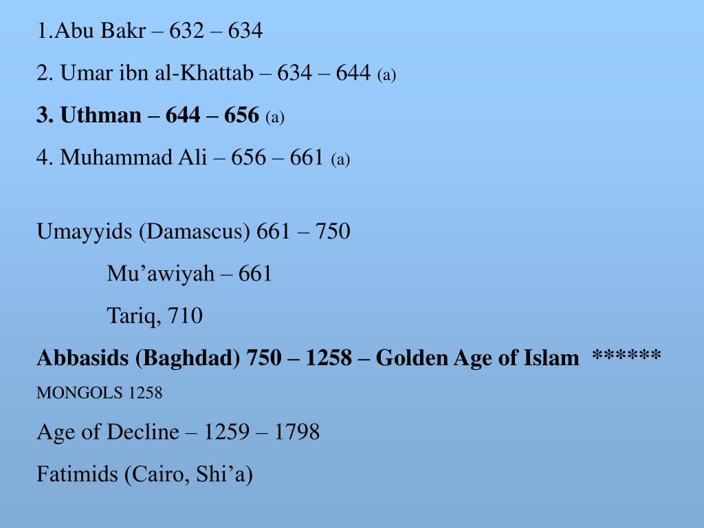 1.Abu Bakr – 632 – 634 2. Umar ibn al-Khattab – 634 – 644 (a) 3. Uthman – 644 – 656 (a) 4. Muhammad Ali – 656 – 661 (a) Umayyids (Damascus) 661 – 750 Mu’awiyah – 661 Tariq, 710 Abbasids (Baghdad) 750 – 1258 – Golden Age of Islam ****** MONGOLS 1258 Age of Decline – 1259 – 1798 Fatimids (Cairo, Shi’a)