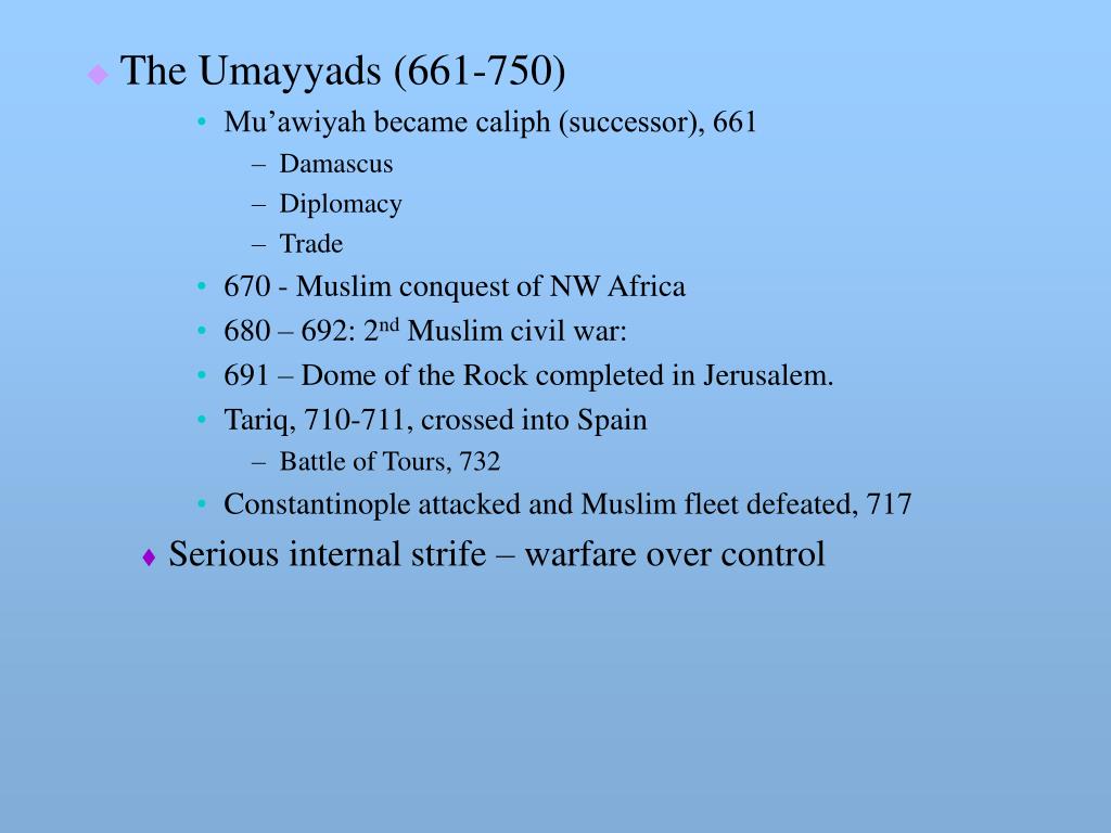 The Umayyads (661-750) • Mu’awiyah became caliph (successor), 661 • Damascus • Diplomacy • Trade • 670 - Muslim conquest of NW Africa • 680 – 692: 2nd Muslim civil war: • 691 – Dome of the Rock completed in Jerusalem. • Tariq, 710-711, crossed into Spain • Battle of Tours, 732 • Constantinople attacked and Muslim fleet defeated, 717 • Serious internal strife – warfare over control
