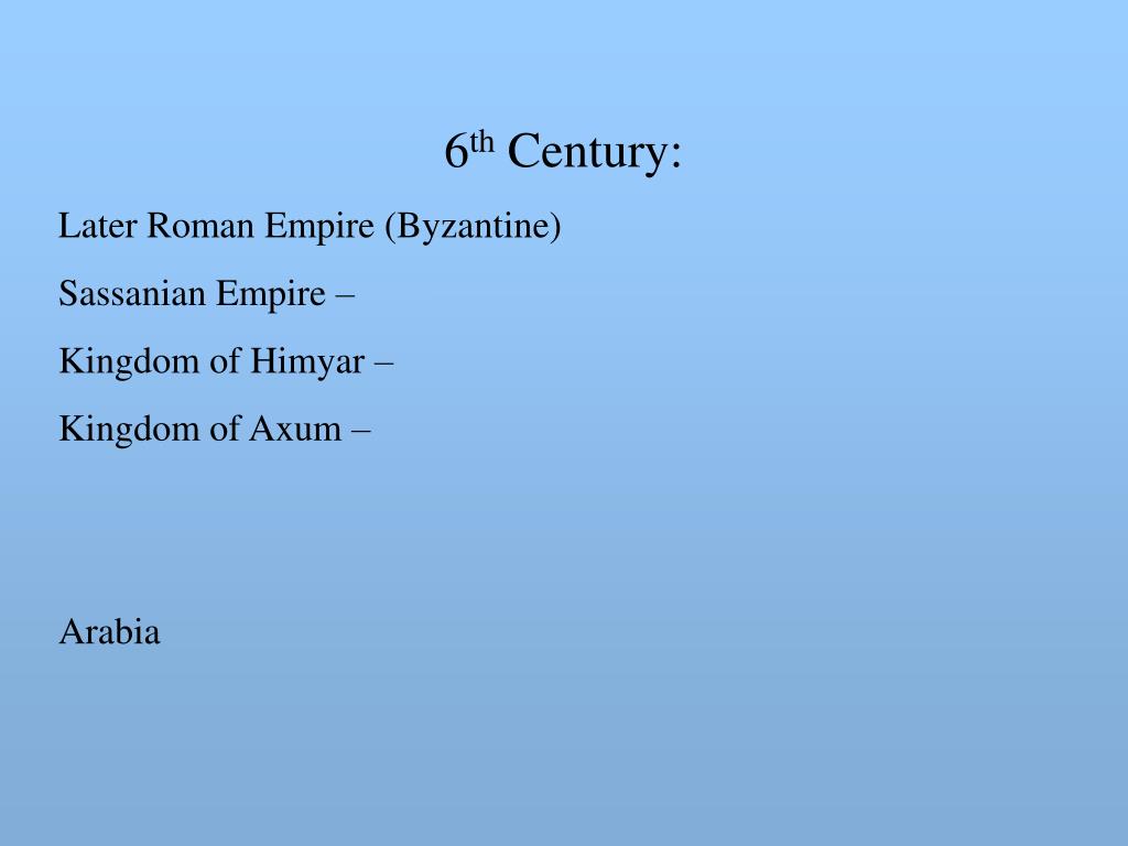 6th Century: Later Roman Empire (Byzantine) Sassanian Empire – Kingdom of Himyar – Kingdom of Axum – Arabia