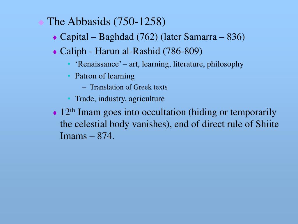 The Abbasids (750-1258) • Capital – Baghdad (762) (later Samarra – 836) • Caliph - Harun al-Rashid (786-809) • ‘Renaissance’ – art, learning, literature, philosophy • Patron of learning • Translation of Greek texts • Trade, industry, agriculture • 12th Imam goes into occultation (hiding or temporarily the celestial body vanishes), end of direct rule of Shiite Imams – 874.