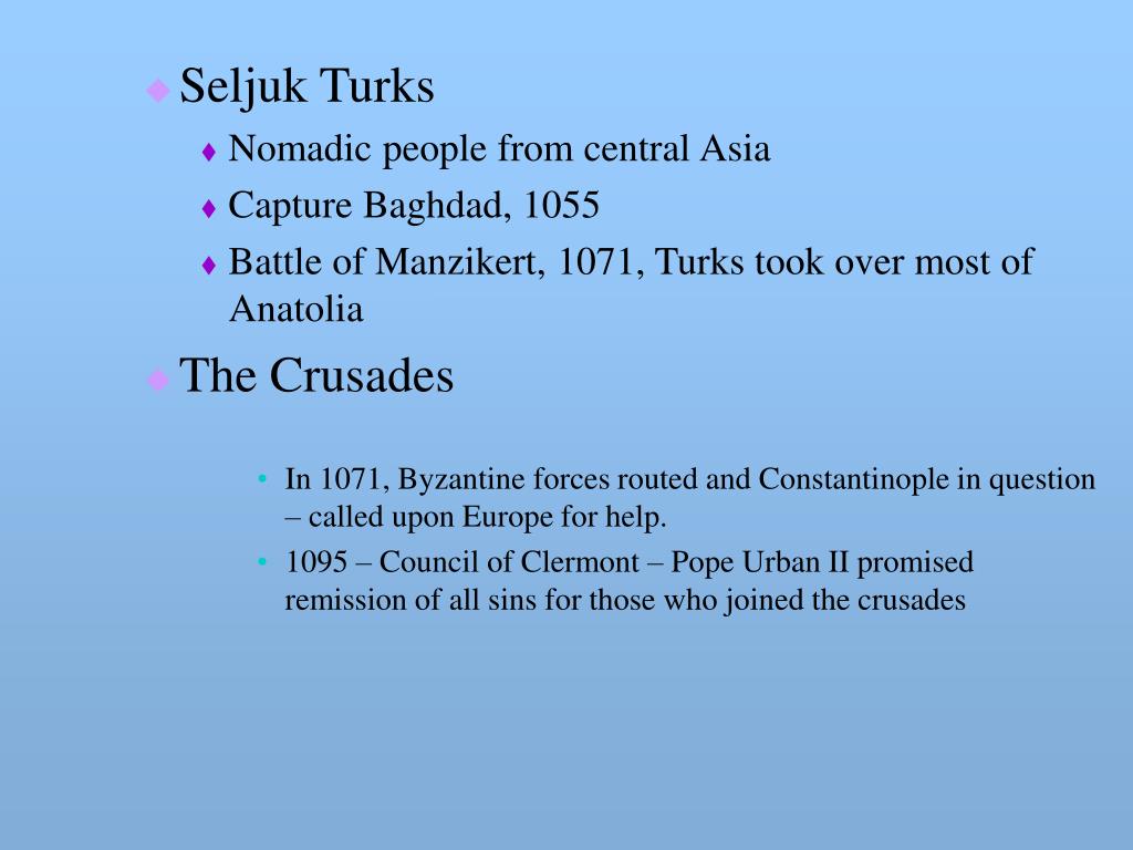 Seljuk Turks • Nomadic people from central Asia • Capture Baghdad, 1055 • Battle of Manzikert, 1071, Turks took over most of Anatolia • The Crusades • In 1071, Byzantine forces routed and Constantinople in question – called upon Europe for help. • 1095 – Council of Clermont – Pope Urban II promised remission of all sins for those who joined the crusades