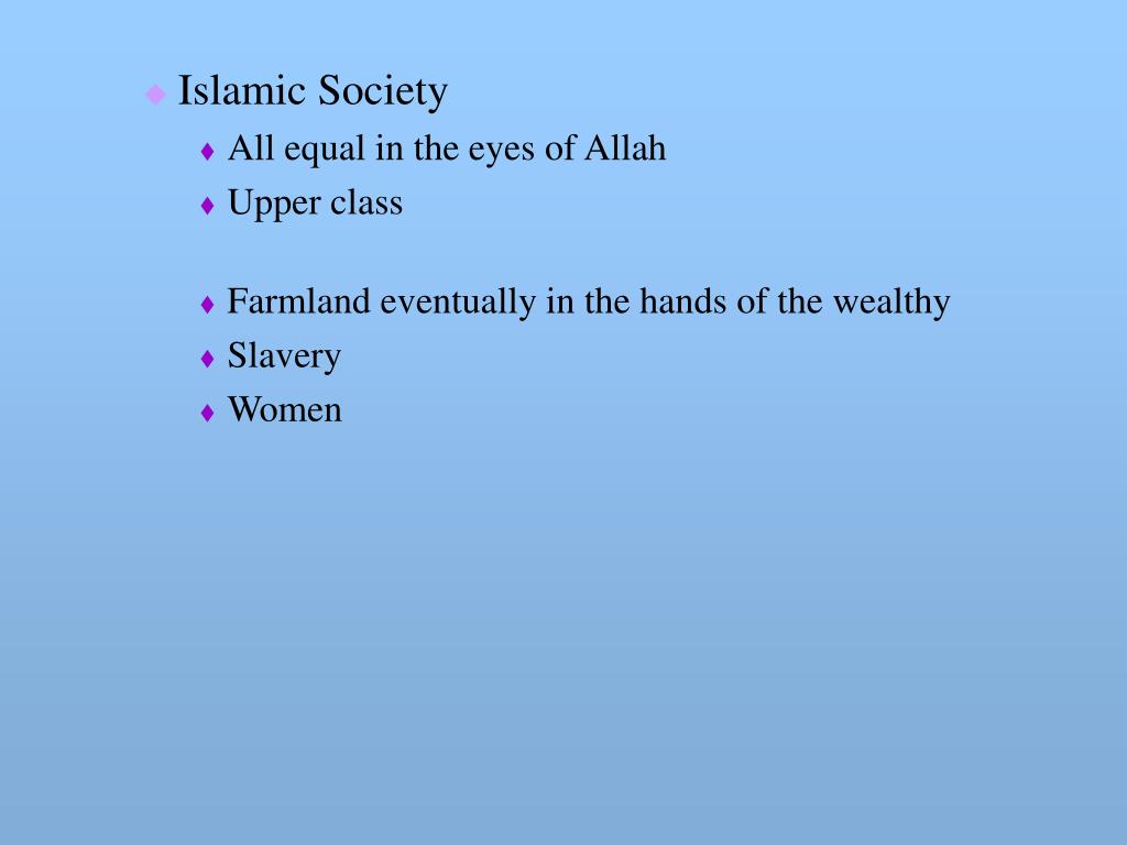 Islamic Society • All equal in the eyes of Allah • Upper class • Farmland eventually in the hands of the wealthy • Slavery • Women
