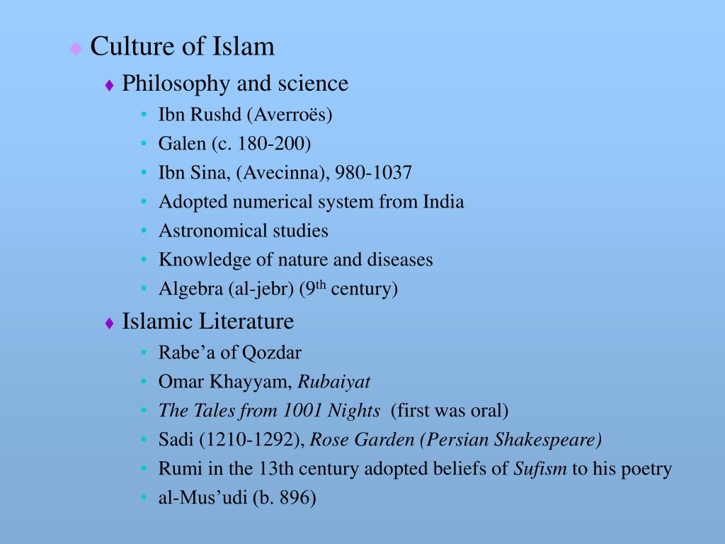 Culture of Islam • Philosophy and science • Ibn Rushd (Averroës) • Galen (c. 180-200) • Ibn Sina, (Avecinna), 980-1037 • Adopted numerical system from India • Astronomical studies • Knowledge of nature and diseases • Algebra (al-jebr) (9th century) • Islamic Literature • Rabe’a of Qozdar • Omar Khayyam, Rubaiyat • The Tales from 1001 Nights (first was oral) • Sadi (1210-1292), Rose Garden (Persian Shakespeare) • Rumi in the 13th century adopted beliefs of Sufism to his poetry • al-Mus’udi (b. 896)