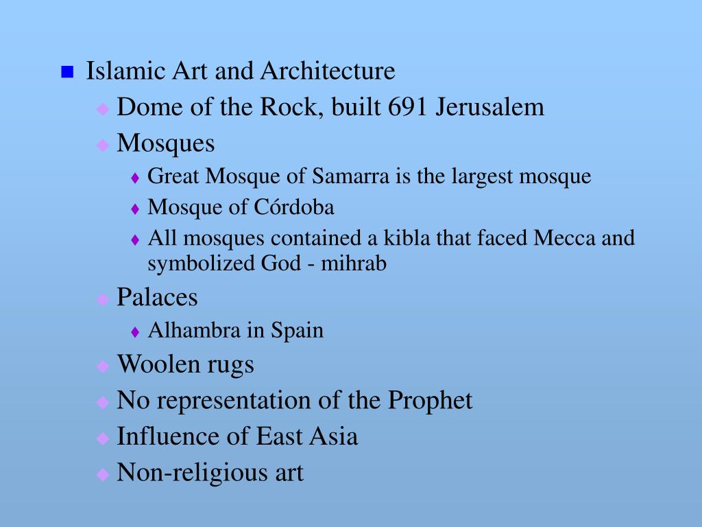 Islamic Art and Architecture • Dome of the Rock, built 691 Jerusalem • Mosques • Great Mosque of Samarra is the largest mosque • Mosque of Córdoba • All mosques contained a kibla that faced Mecca and symbolized God - mihrab • Palaces • Alhambra in Spain • Woolen rugs • No representation of the Prophet • Influence of East Asia • Non-religious art