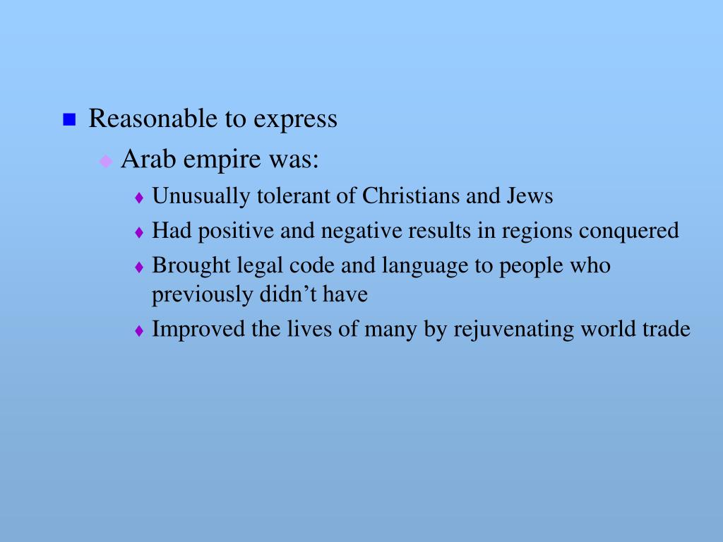 Reasonable to express • Arab empire was: • Unusually tolerant of Christians and Jews • Had positive and negative results in regions conquered • Brought legal code and language to people who previously didn’t have • Improved the lives of many by rejuvenating world trade