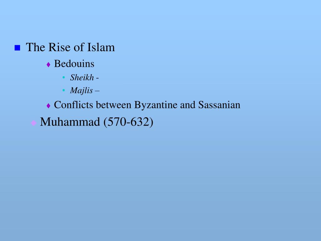 The Rise of Islam • Bedouins • Sheikh - • Majlis – • Conflicts between Byzantine and Sassanian • Muhammad (570-632)
