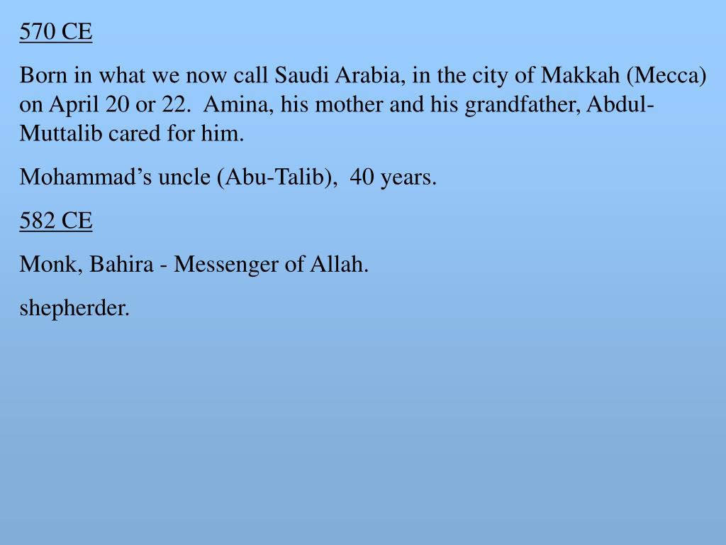 570 CE Born in what we now call Saudi Arabia, in the city of Makkah (Mecca) on April 20 or 22. Amina, his mother and his grandfather, Abdul-Muttalib cared for him. Mohammad’s uncle (Abu-Talib), 40 years. 582 CE Monk, Bahira - Messenger of Allah. shepherder.