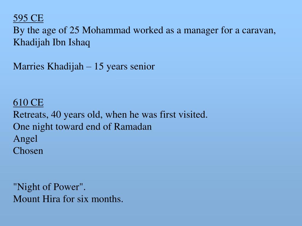 595 CE By the age of 25 Mohammad worked as a manager for a caravan, Khadijah Ibn Ishaq Marries Khadijah – 15 years senior 610 CE Retreats, 40 years old, when he was first visited. One night toward end of Ramadan Angel Chosen "Night of Power". Mount Hira for six months.