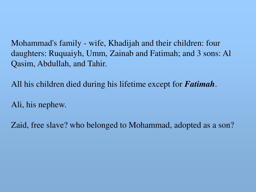 Mohammad's family - wife, Khadijah and their children: four daughters: Ruquaiyh, Umm, Zainab and Fatimah; and 3 sons: Al Qasim, Abdullah, and Tahir. All his children died during his lifetime except for Fatimah. Ali, his nephew. Zaid, free slave? who belonged to Mohammad, adopted as a son?