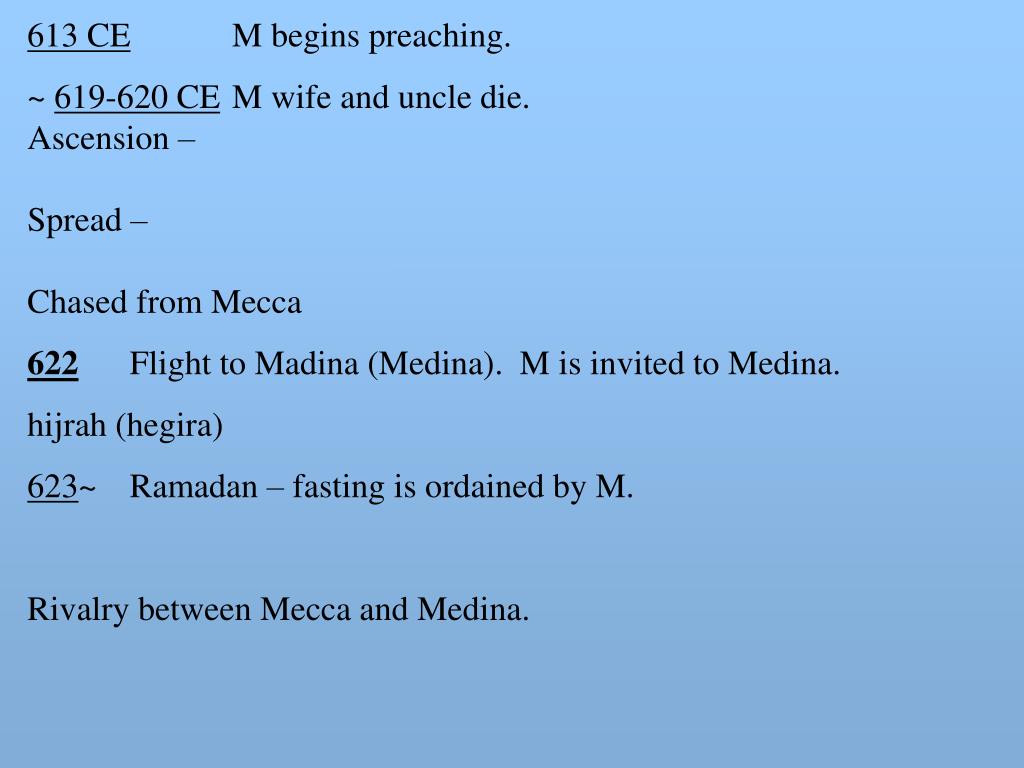 613 CE M begins preaching. ~ 619-620 CE M wife and uncle die. Ascension – Spread – Chased from Mecca 622 Flight to Madina (Medina). M is invited to Medina. hijrah (hegira) 623~ Ramadan – fasting is ordained by M. Rivalry between Mecca and Medina.