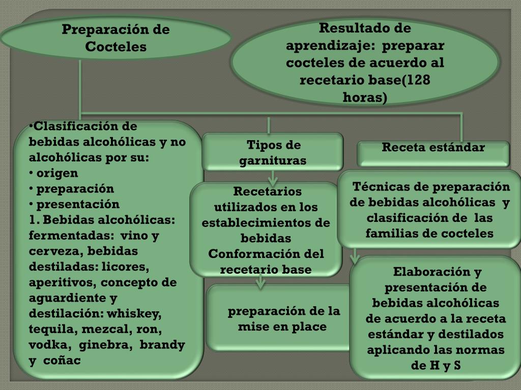 Preparación de Cocteles Resultado de aprendizaje: preparar cocteles de acuerdo al recetario base(128 horas) • Clasificación de bebidas alcohólicas y no alcohólicas por su: • origen • preparación • presentación • 1. Bebidas alcohólicas: fermentadas: vino y cerveza, bebidas destiladas: licores, aperitivos, concepto de aguardiente y destilación: whiskey, tequila, mezcal, ron, vodka, ginebra, brandy y coñac Tipos de garnituras Receta estándar Técnicas de preparación de bebidas alcohólicas y clasificación de las familias de cocteles Recetarios utilizados en los establecimientos de bebidas Conformación del recetario base Elaboración y presentación de bebidas alcohólicas de acuerdo a la receta estándar y destilados aplicando las normas de H y S preparación de la mise en place