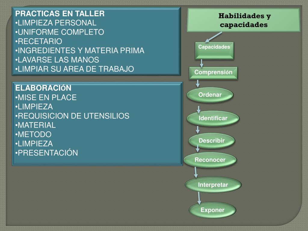 PRACTICAS EN TALLER • LIMPIEZA PERSONAL • UNIFORME COMPLETO • RECETARIO • INGREDIENTES Y MATERIA PRIMA • LAVARSE LAS MANOS • LIMPIAR SU AREA DE TRABAJO Habilidades y capacidades Capacidades Comprensión • ELABORACIÓN • MISE EN PLACE • LIMPIEZA • REQUISICION DE UTENSILIOS • MATERIAL • METODO • LIMPIEZA • PRESENTACIÓN Ordenar Identificar Describir Reconocer Interpretar Exponer