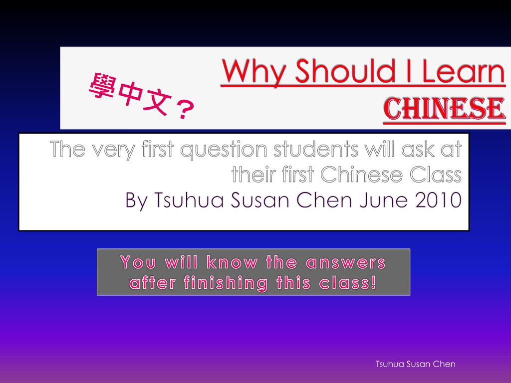 Why Should I Learn Chinese 學中文? The very first question students will ask at their first Chinese Class By Tsuhua Susan Chen June 2010 You will know the answers after finishing this class! Tsuhua Susan Chen