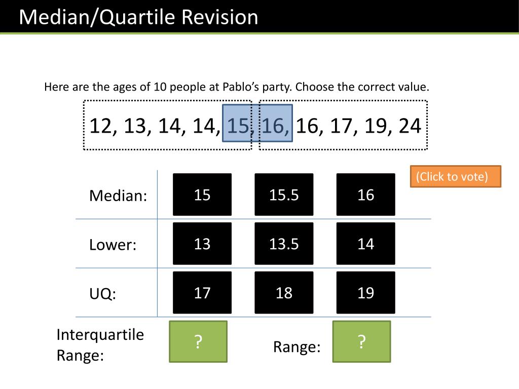 Median/Quartile Revision Here are the ages of 10 people at Pablo’s party. Choose the correct value. 12, 13, 14, 14, 15, 16, 16, 17, 19, 24 (Click to vote) 15 15.5 16 Median: 13 13.5 14 Lower: 17 18 19 UQ: Interquartile Range: ? ? 3 12 Range:
