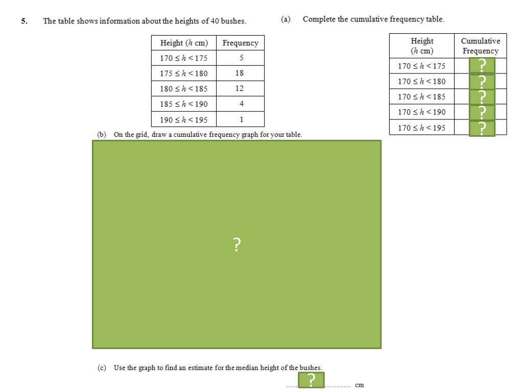 Worksheet Cumulative Frequency Graphs Printed handout. Q5, 6, 7, 8, 9, 10 Reference: GCSE-GroupedDataCumFreq