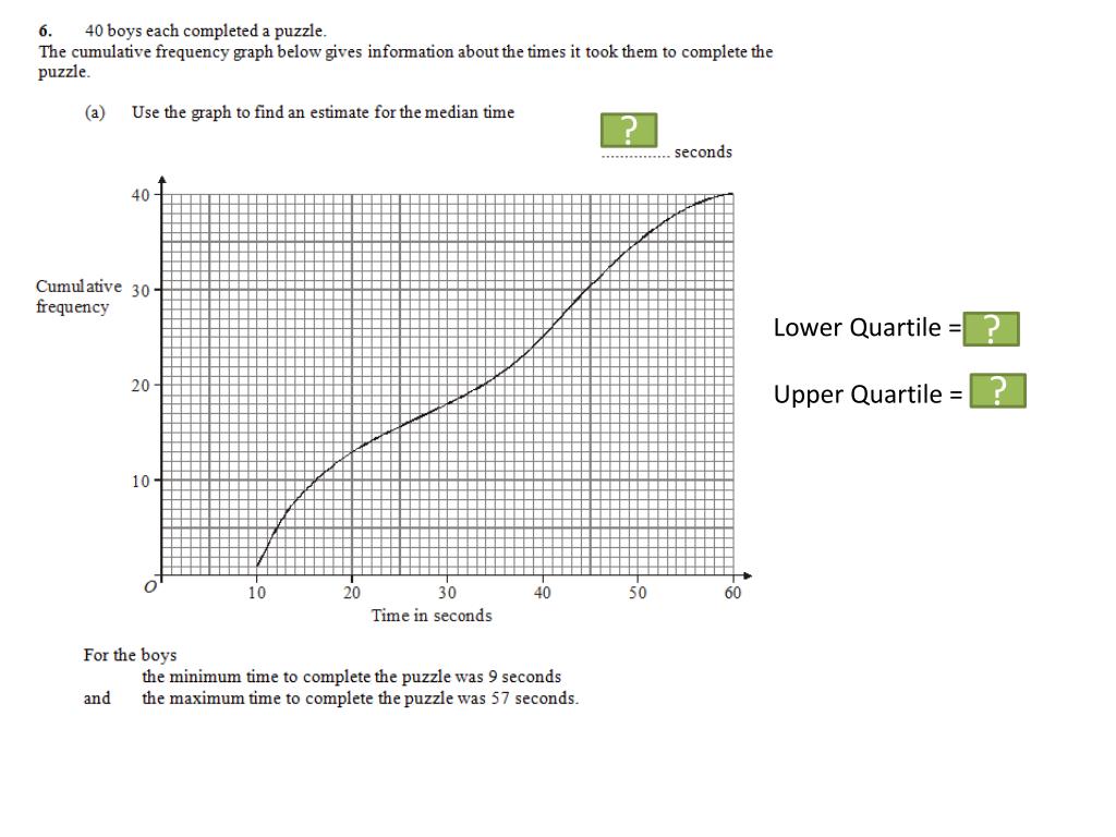 We previously found: Minimum = 9, Maximum = 57, LQ = 16, Median = 34, UQ = 44.5 ? 1 mark: Range/interquartile range of boys’ times is greater. 1 mark: Median of boys’ times is greater. ?