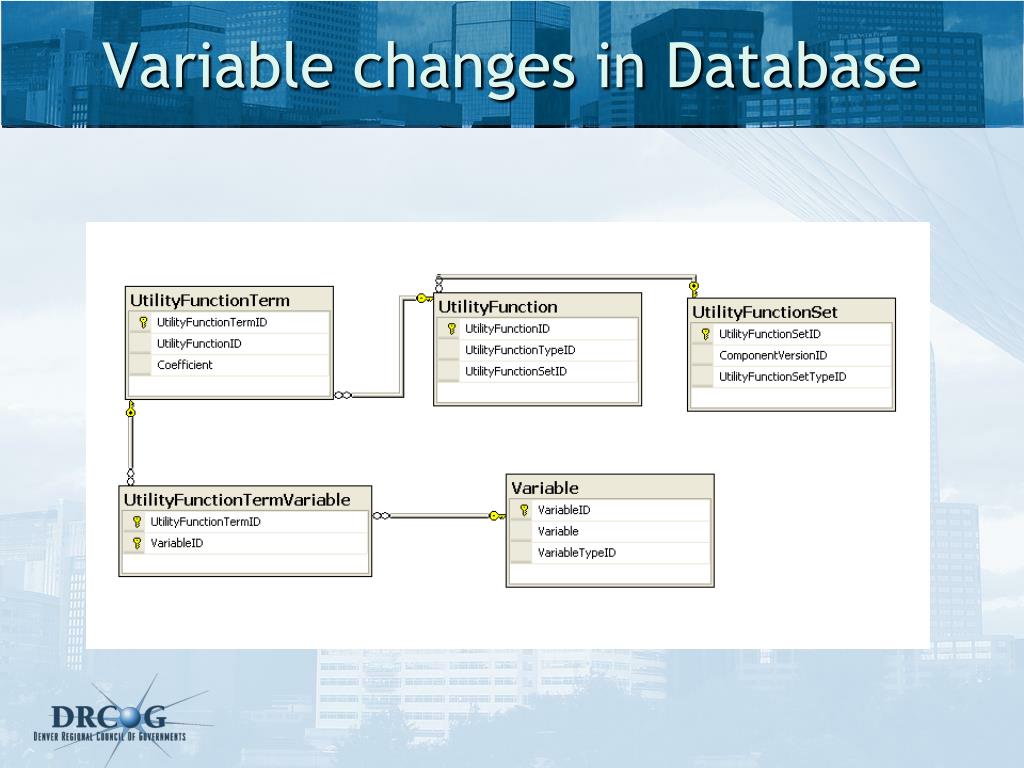 Fix/update variables What (examples) – • Simple: changes to input data/ GISDK • Simple once you get used to it - change SQL Server table / variables in C# • Pretty hard - understand how component works (older sibling school, logit solver) How – wrote GISDK/ C# model components Why – changes to variables over time are very common