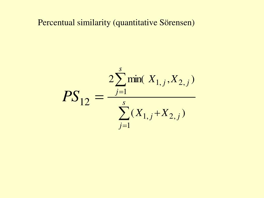 Sample similarity based on qualitative data Sörensen Jacquard d - number of species absent from both samples (usually not used)