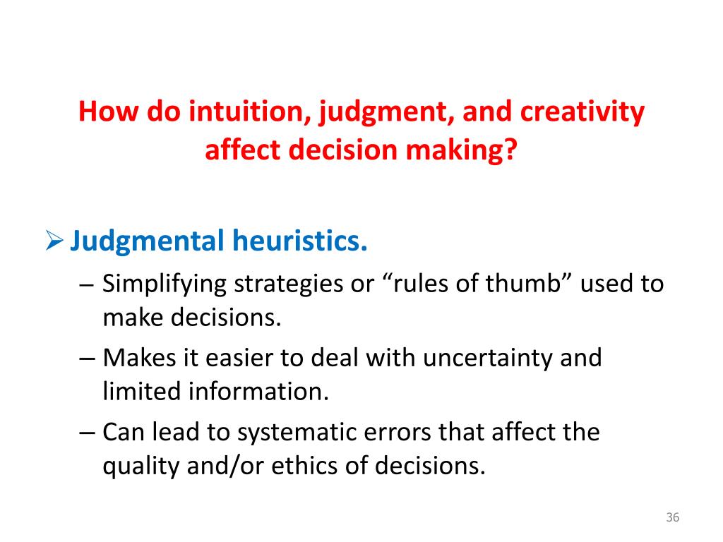 How do intuition, judgment, and creativity affect decision making? • Judgmental heuristics. • Simplifying strategies or “rules of thumb” used to make decisions. • Makes it easier to deal with uncertainty and limited information. • Can lead to systematic errors that affect the quality and/or ethics of decisions.