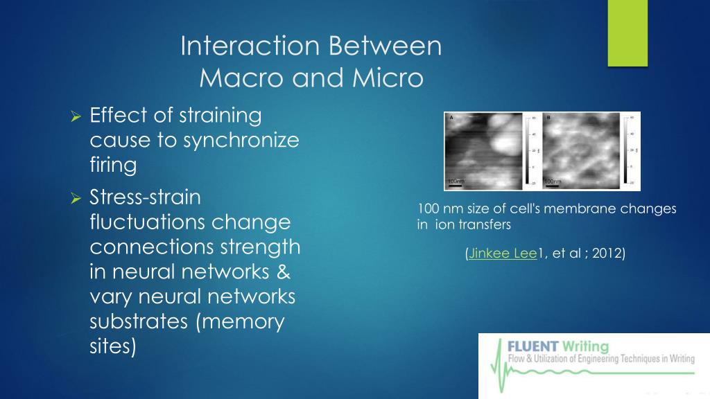 Interaction Between Macro and Micro • Effect of straining cause to synchronize firing • Stress-strain fluctuations change connections strength in neural networks & vary neural networks substrates (memory sites) 100 nm size of cell's membrane changes in ion transfers (Jinkee Lee1, et al ; 2012)