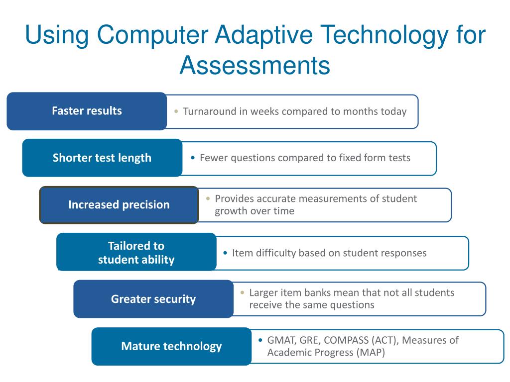 Using Computer Adaptive Technology for Assessments Shorter test length Increased precision • Provides accurate measurements of student growth over time Faster results • Turnaround in weeks compared to months today Tailored to student ability • Fewer questions compared to fixed form tests Greater security Mature technology • Item difficulty based on student responses • Larger item banks mean that not all students receive the same questions • GMAT, GRE, COMPASS (ACT), Measures of Academic Progress (MAP)