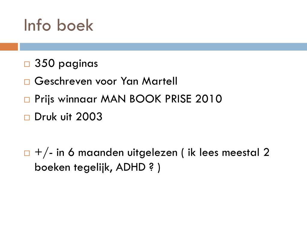 Info boek • 350 paginas • Geschreven voor YanMartell • Prijs winnaar MAN BOOK PRISE 2010 • Druk uit 2003 • +/- in 6 maanden uitgelezen ( ik lees meestal 2 boeken tegelijk, ADHD ? )