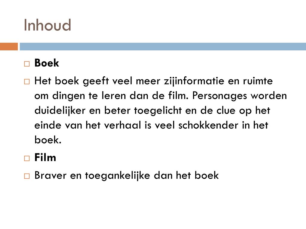 Inhoud • Boek • Het boek geeft veel meer zijinformatie en ruimte om dingen te leren dan de film. Personages worden duidelijker en beter toegelicht en de clue op het einde van het verhaal is veel schokkender in het boek. • Film • Braver en toegankelijke dan het boek