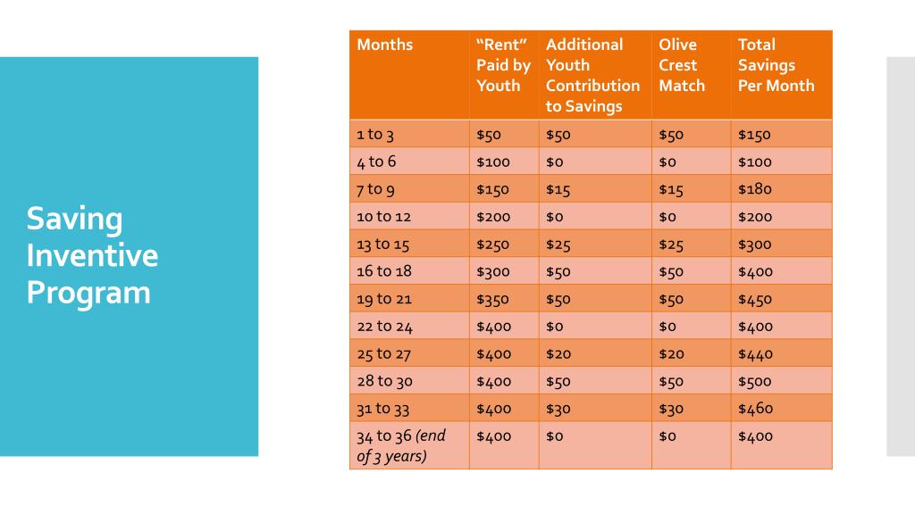Graduated Savings Program “Rent Model” • Voluntary program to practice budgeting and encourage saving • Participants are encouraged to pay voluntary monthly “rent” out of their income • Starts at $50/month, increasing by $50 every 3 months • “Rent” is saved on behalf of youth • Beyond rent paid, any additional participant contribution is matched by Olive Crest 1:1 • Max match of $250 • Participant must be meeting all goals & have no rule violations to participate in match program • All participant’s savings is returned to them upon departure from program Ami RowlandOlive Crest