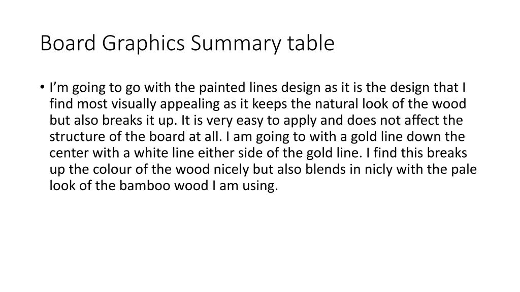 Board Graphics Summary table • I’m going to go with the painted lines design as it is the design that I find most visually appealing as it keeps the natural look of the wood but also breaks it up. It is very easy to apply and does not affect the structure of the board at all. I am going to with a gold line down the center with a white line either side of the gold line. I find this breaks up the colour of the wood nicely but also blends in nicly with the pale look of the bamboo wood I am using.