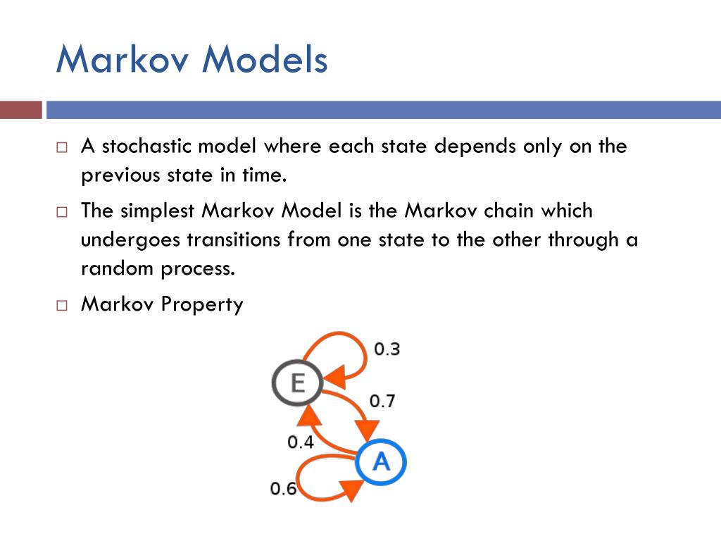 Markov Models • A stochastic model where each state depends only on the previous state in time. • The simplest Markov Model is the Markov chain which undergoes transitions from one state to the other through a random process. • Markov Property