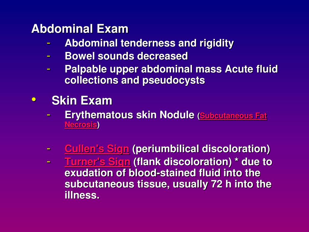 Abdominal Exam • Abdominal tenderness and rigidity • Bowel sounds decreased • Palpable upper abdominal mass Acute fluid collections and pseudocysts • Skin Exam • Erythematous skin Nodule (Subcutaneous Fat Necrosis) • Cullen's Sign (periumbilical discoloration) • Turner's Sign (flank discoloration) * due to exudation of blood-stained fluid into the subcutaneous tissue, usually 72 h into the illness.