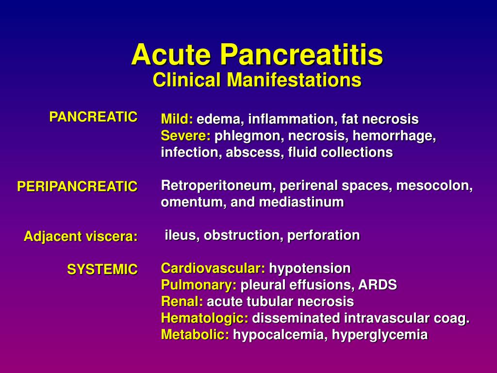Acute PancreatitisClinical Manifestations PANCREATIC PERIPANCREATIC Adjacent viscera: SYSTEMIC Mild: edema, inflammation, fat necrosis Severe:phlegmon, necrosis, hemorrhage, infection, abscess, fluid collections Retroperitoneum, perirenal spaces, mesocolon, omentum, and mediastinum ileus, obstruction, perforation Cardiovascular: hypotension Pulmonary: pleural effusions, ARDS Renal: acute tubular necrosis Hematologic: disseminated intravascular coag. Metabolic:hypocalcemia, hyperglycemia